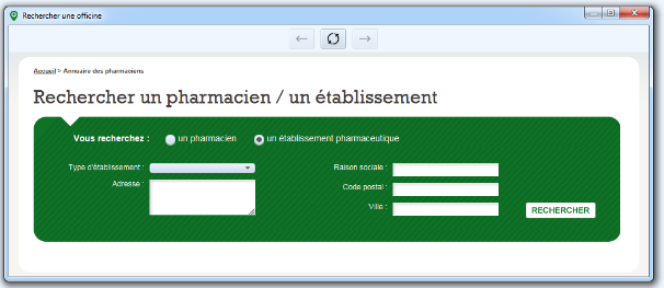 Le menu ‘Outils’ / ‘Annuaire’ permet d’accéder à l’annuaire des officines du CNOP.
